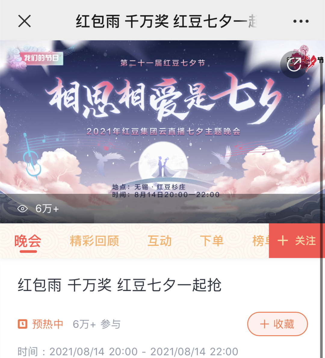 除了央視的七夕晚會(huì),紅豆集團(tuán)還會(huì)給大家奉獻(xiàn)一場(chǎng)特別的紅豆七夕節(jié)晚會(huì)。與大家在七夕節(jié)當(dāng)晚共享視覺與福利盛宴。去年的紅豆七夕節(jié)20周年直播主題晚會(huì)更是創(chuàng)造了1.2億直播觀看量!
