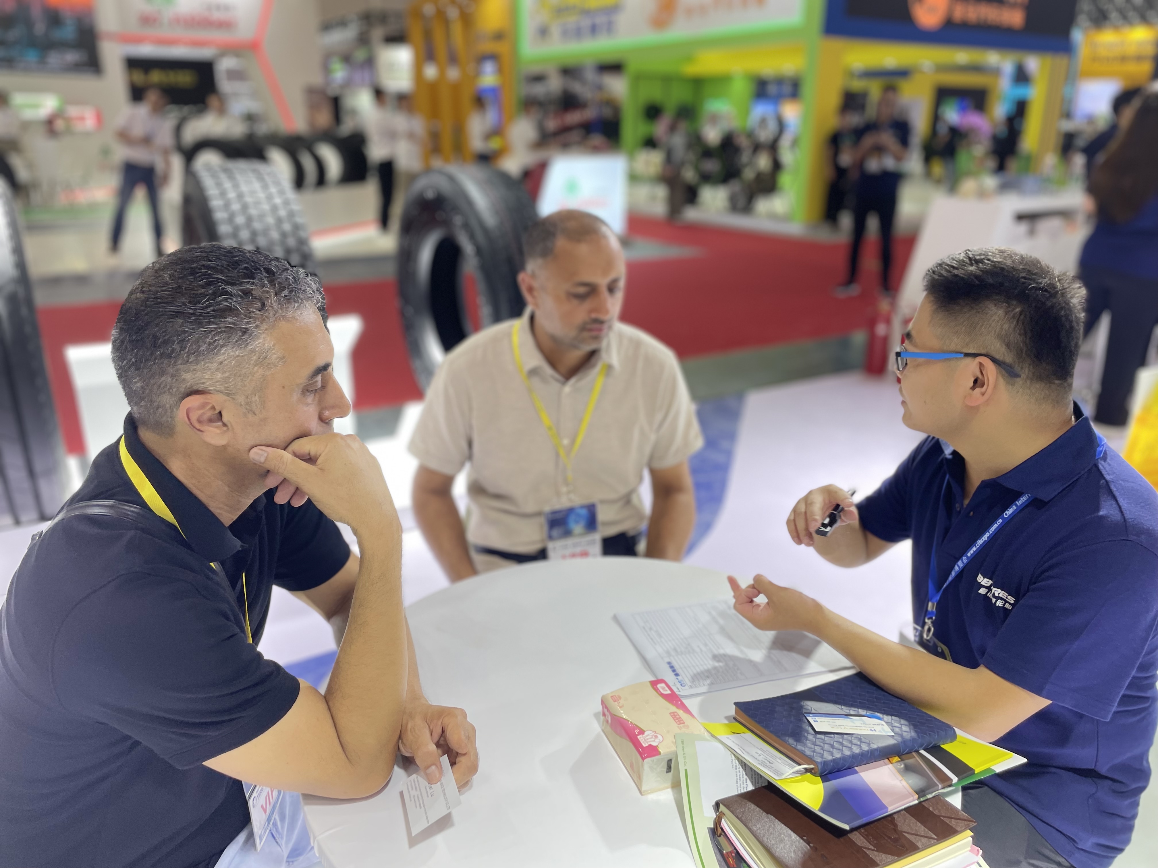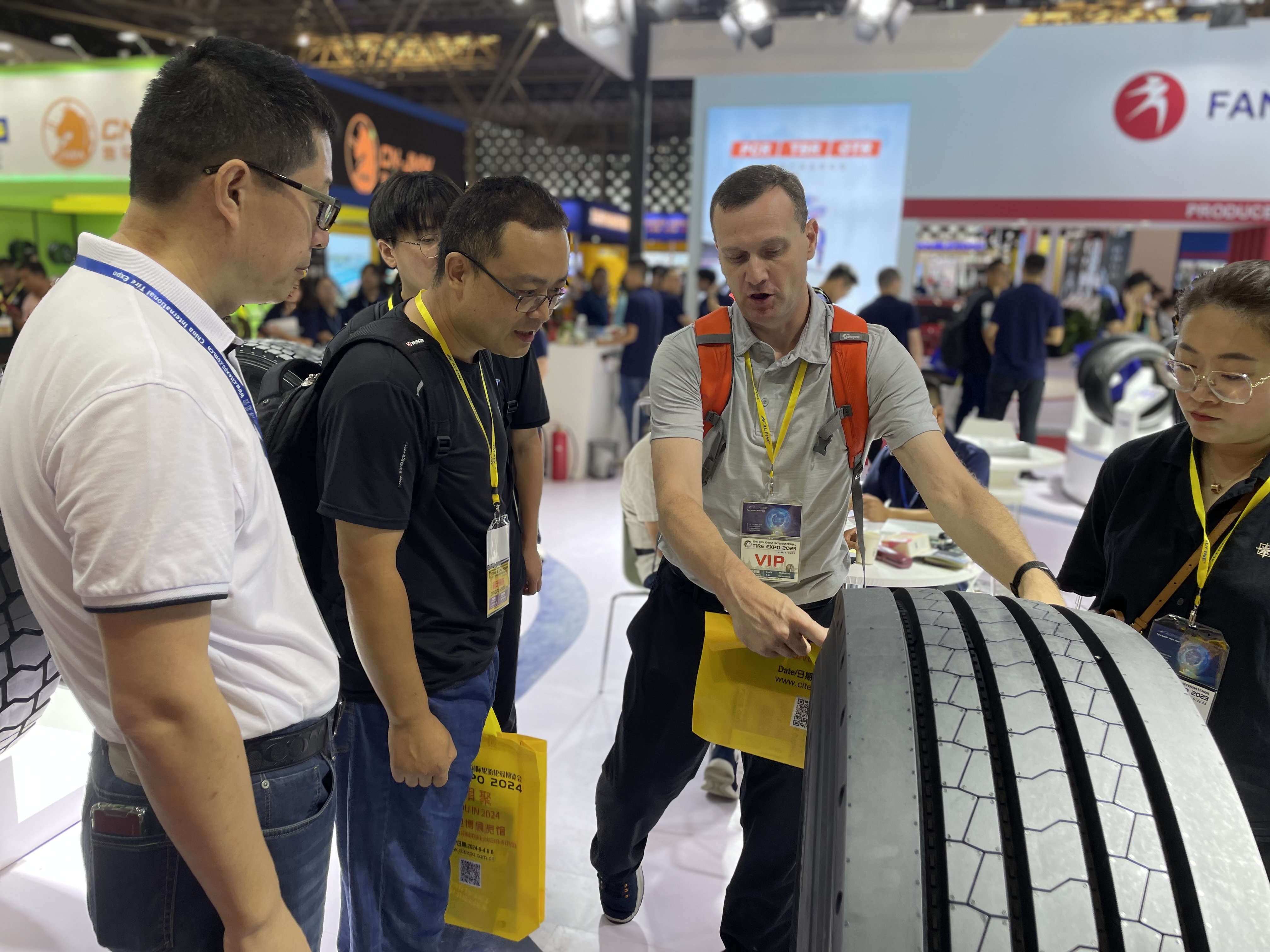 其中,中長途承載胎KTX816,其獨特的花紋塊設(shè)計保證了優(yōu)質(zhì)的產(chǎn)品性能,耐磨舒適性凸顯,受到客戶的青睞與認(rèn)可;CAT8、CRT8等越野胎產(chǎn)品,出色的耐磨性、抓地力與牽引性能表現(xiàn)亮眼,不少國內(nèi)外客商對其表現(xiàn)出濃厚的興趣。除此之外,新能源輪胎EV1、CHP5-EV等系列也是現(xiàn)場聚焦熱點,舒適安全、節(jié)油耐磨等性能優(yōu)勢,亦吸引了不少海外采購商駐足咨詢。